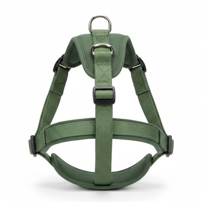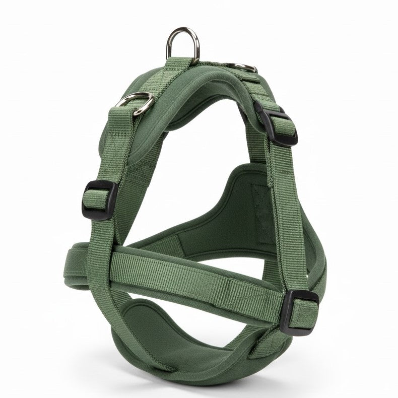Een hondenharnas met verstelbare banden rond borst en buik. Het harnas heeft een bovenstuk met een ring voor de lijn en klikgespen aan de zijkanten. De binnenkant heeft een vaste voering en het model verdeelt de druk over de romp.