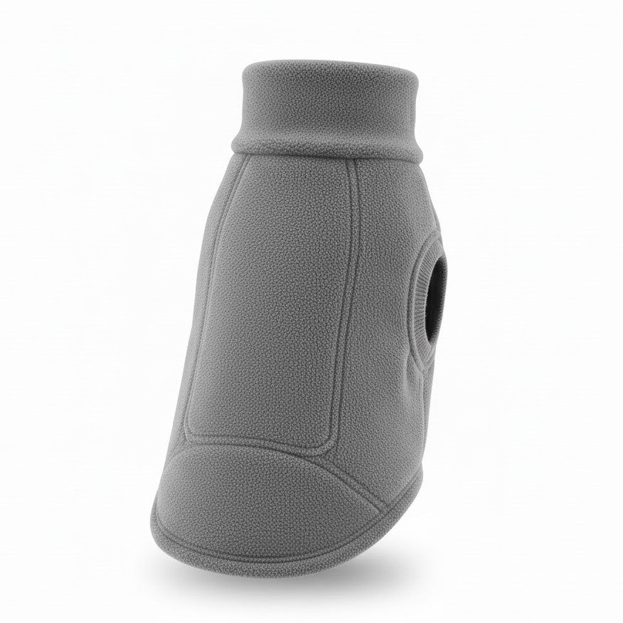 Een hondenjas van fleece met een hoge kraag en een gesloten rugpand. De jas heeft openingen bij de voorpoten en wordt over het hoofd aangetrokken. Het model bestaat uit één stuk en bedekt zowel borst als rug.