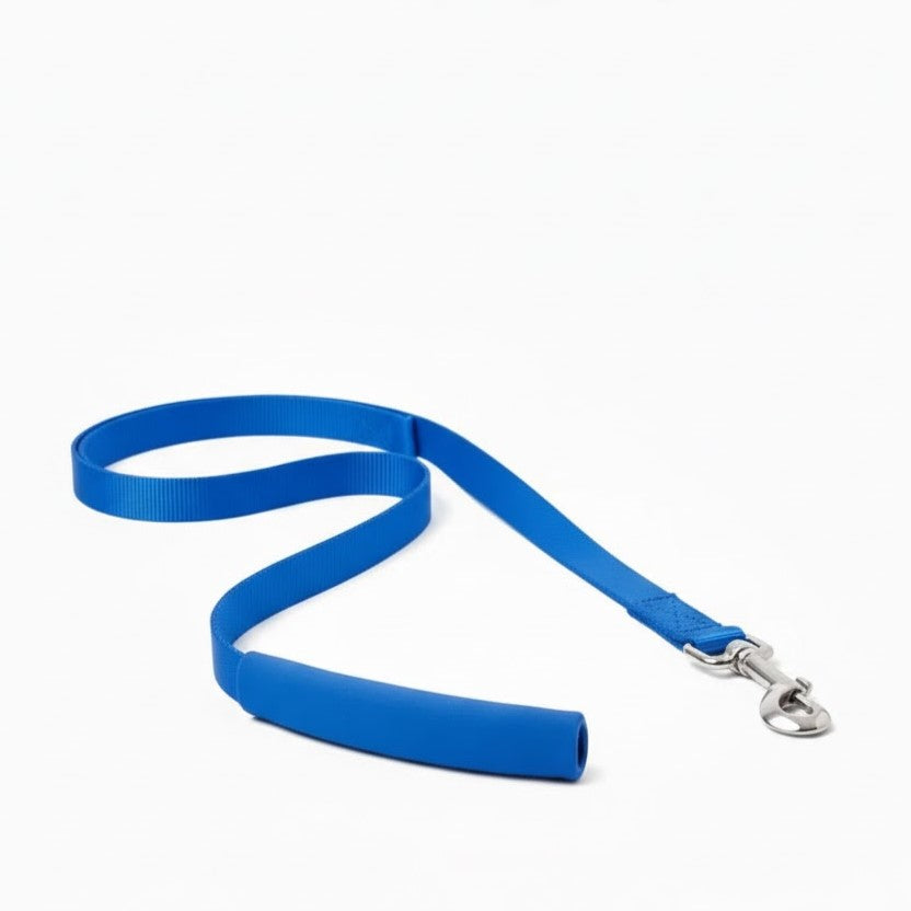 Een hondenriem van stevig bandmateriaal met een vaste handgreep en een metalen haak voor bevestiging aan een halsband of harnas. De riem is buigzaam en geschikt voor dagelijks gebruik tijdens wandelingen.