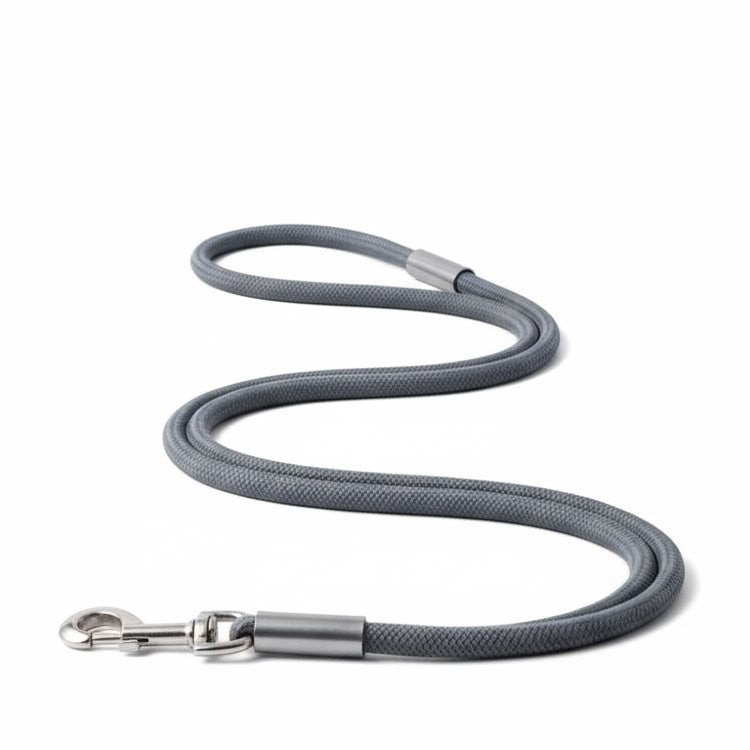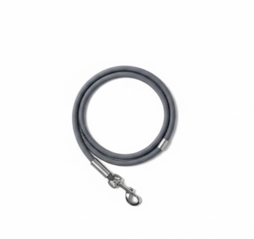 Een hondenriem met een ronde lijn en een metalen afwerking bij de verbinding met de haak. De riem heeft een vaste lus als handgreep en een metalen haak voor bevestiging aan een halsband of harnas. Het model is geschikt voor dagelijks gebruik.