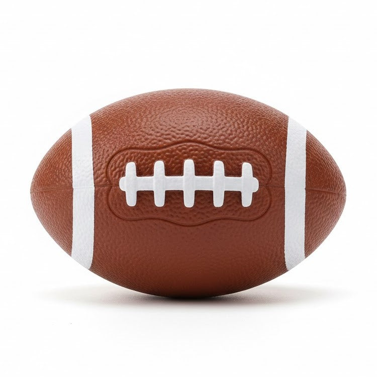 Een piepend hondenspeeltje in de vorm van een ovale bal. Het oppervlak heeft een structuur voor extra grip en het speelgoed geeft een piepgeluid bij druk. Geschikt voor spelen en werpspelletjes.