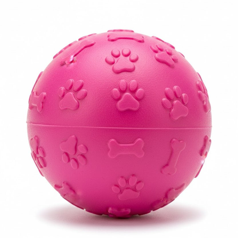 Een piepend hondenspeeltje in de vorm van een ronde bal. De bal heeft een oppervlak met pootafdrukreliëf en geeft een piepgeluid bij druk. Geschikt voor spelen en werpen.