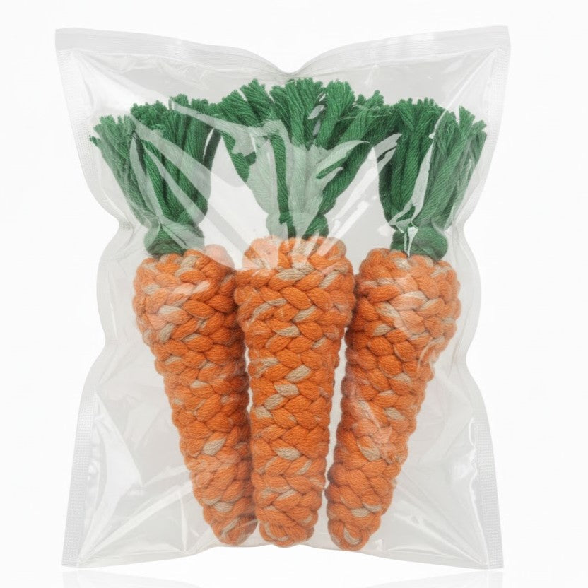 Een set van drie kauwspeeltjes voor honden, uitgevoerd in de vorm van een wortel. De speeltjes zijn gemaakt van gevlochten touw en geschikt voor kauwen, trekken en spel.